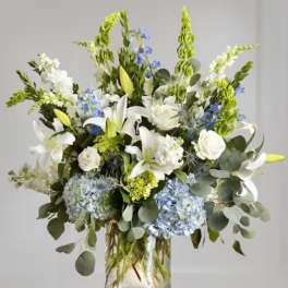 All arrangements are pictured in the deluxe version. Due to limited floral and hard goods supply, all arrangements are subject to substitutions. Most colored vases pictured will most likely be changed to a clear vase. If you have specific requests, please call the shop at 262.583.4719.